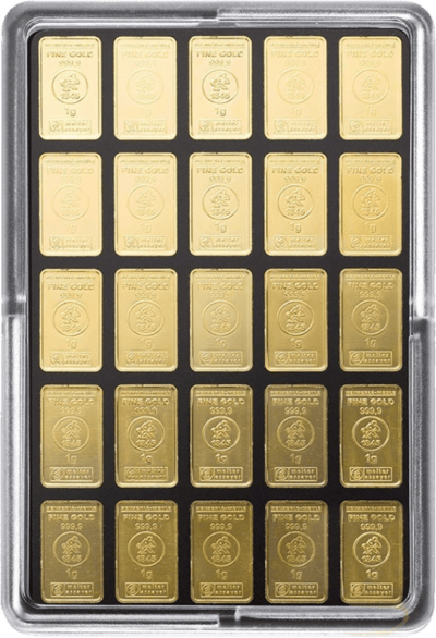 Das Unternehmen Heimerle und Meule gehört zu den renommiertesten und ältesten Herausgebern von Gold– und Silberbarren in Deutschland. Hier profitieren Sie von einer hochwertigen Produktion „Made in Germany“, die noch dazu LBMA zertifiziert ist. Die einzelnen Plättchen lassen sich bei diesen Goldbarren 50 x 1 g Goldbarren sehr leicht durch Knicken voneinander trennen. Der Hersteller bietet noch viele andere Stückelungen an, die Sie ebenfalls hier bestellen können.