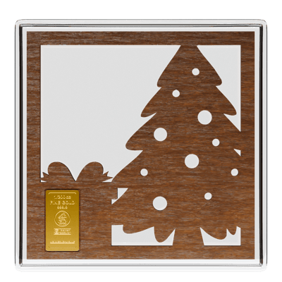 Die kunstvolle Gestaltung dieses Goldbarrens zeigt sich in einer edlen Holzoptik-Präsentation. Der filigrane Tannenbaum mit seinen liebevoll gestalteten Kugeln und Geschenken darunter weckt sofort weihnachtliche Gefühle. Doch hinter dieser festlichen Fassade verbirgt sich pures Gold mit einer Feinheit von 999/1.000 – das ist nahezu reines Gold in seiner edelsten Form!