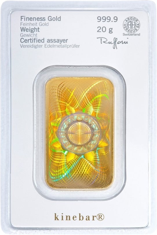 Der 20g Kinebar Goldbarren Heraeus misst 40,4 x 23,3 x 1,3 mm und ist damit der zweitgrößte Kinebar Goldbarren von Heraeus. Nur noch der 1-Unze-Barren ist um etwa 50% größer. Sachlich nehmen sich die Goldbarren nichts. Alle erreichen mit einer Feinheit von 99,99% den höchsten Qualitätsstandard für Gold.