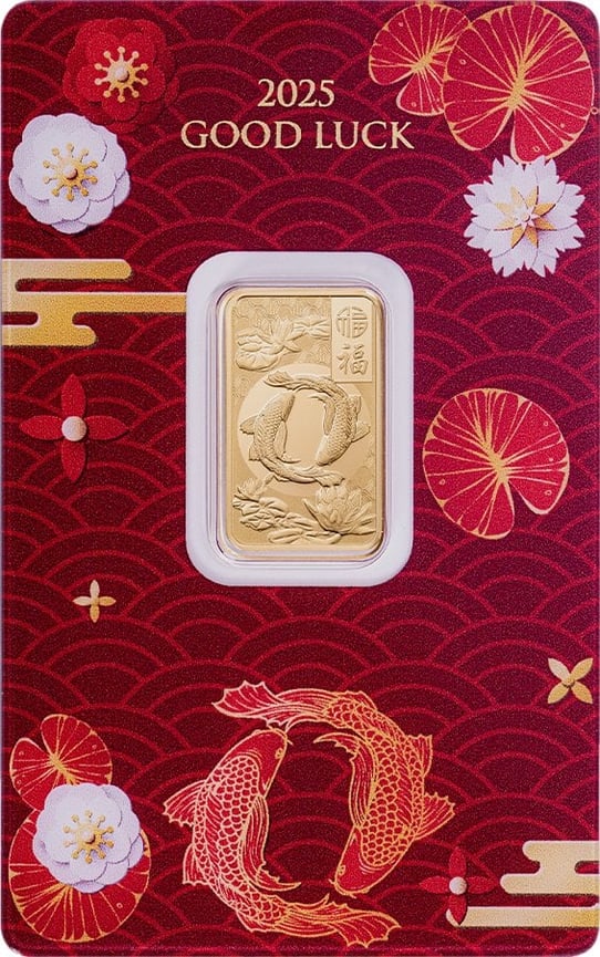 Das hochwertige Gold mit einer außergewöhnlichen Reinheit von 999,9/1000 macht diesen Barren zu einem erstklassigen Inflationsschutz. Die detailreiche Gestaltung zeigt zwei anmutige Kois, die von Lotusblüten und Seerosenblättern umrahmt werden - ein traditionelles Symbol für Harmonie und Erfolg.