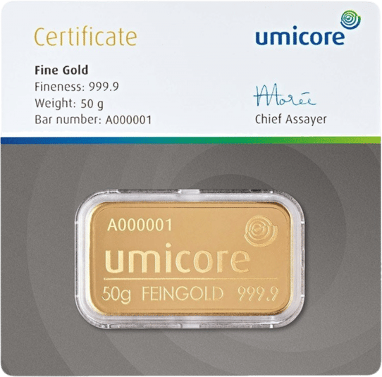 50 g Gold von Umicore – Dieser Barren eignet sich für Anleger, die Wert auf eine stabile Rendite und eine sichere Form der Krisenvorsorge wünschen. Herausgegeben wird dieser Barren von der belgischen Umicore AG & Co. KG.