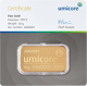 Exklusives Design: 50g Feingold mit eingraviertem Umicore-Logo und Seriennummer, präsentiert in sicherem Blister