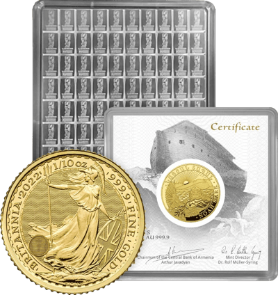 Die Britannia Goldmünze zeigt auf der Vorderseite die Frauenfigur mit Dreizack und Schild. Sie weist eine extra Fälschungssicherheit auf. Die Rückseite zeigt Queen Elizabeth II. im Seitprofil. Die Arche Noah Goldmünze zeigt die Arche Noah vor der Berglandschaft Ararat am Ende der Sintflut. Über ihr scheint die Sonne und links unten ist eine Taube mit Olivenzweig zu sehen. Auf der Rückseite ist das Wappen Armeniens zu sehen. Das Prägejahr der Arche Noah Münzen ist divers. Der 100g Tafelbarren aus Silber besteht aus 10 Reihen und 10 Spalten von Kleinstbarren. Einzelne Barren können nach Bedarf an den Sollbruchstellen getrennt werden.