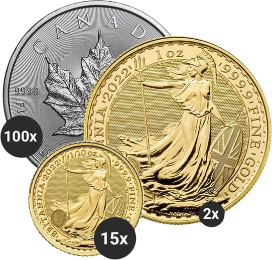 - Motiv: Gold Britannia, Silber Maple Leaf, Fidschi Silbermünzbarren