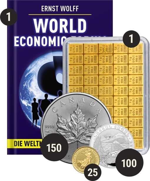 Schützen Sie Ihre finanzielle Zukunft jetzt mit unserem besonderen Produkt Krisen-Absicherung (Paket L)! Verstärken Sie Ihr Anlageportfolio mit einer einzigartigen Auswahl an Arche Noah, Maple Leaf, Britannia Münzen und den Valcambi Tafelbarren. Außerdem finden Sie im Paket das informationsreiche World Economic Forum Buch von Ernst Wolff. Dieses umfassende Kettner-Edelmetalle Krisenabsicherungspaket beinhaltet alles, was Sie sich als Anleger wünschen können: biblische Münzen, repräsentative Münzen für die kanadische Kultur und Geschichte, international anerkannte Edelmetalle mit hoher Wertsteigerung und wertvolles Wissen über internationale Zusammenarbeit. Nutzen Sie diese Chance, Ihr Portfolio zu diversifizieren und somit den Wert zu steigern. Sichern Sie sich jetzt unser exklusives Kettner-Edelmetalle Paket und werden Sie Teil der beeindruckenden Welt der Edelmetalle!