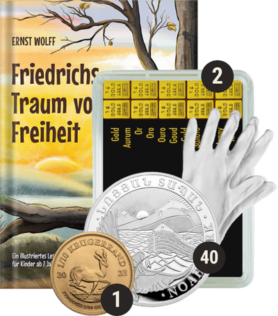 - Paketinhalt: 2 x 5 g Gold Tafelbarren Combibarren (Valcambi), 1 x BUCH: Friedrichs Traum von der Freiheit von Ernst Wolff (Autor), 40 x 1/4 Unze Silber Arche Noah 2023, 1 x 1/10 Unze Gold Krügerrand 2023, 1 x Münzhandschuhe (100% Baumwolle)
