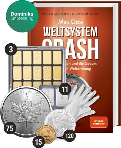 Zusätzlich zu diesen wertvollen Edelmetallen enthält das Paket auch zwei wertvolle Zugaben. Zum einen erhalten Sie ein Paar Baumwollhandschuhe, damit Sie Ihre Edelmetalle sicher handhaben können. Zum anderen liegt dem Paket das Buch "Weltsystemcrash" von Max Otte bei. Dieses Buch bietet tiefe Einblicke in die Welt der Finanzen und Krisenprävention - ein Muss für jeden ernsthaften Investor.