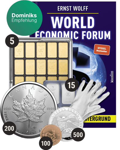 Um Ihr Erlebnis mit dem "Schutzschild XL" zu vervollständigen, erhalten Sie zu Ihrer Bestellung ein Paar Baumwollhandschuhe gratis dazu. Diese Handschuhe ermöglichen es Ihnen, Ihre kostbaren Metalle zu handhaben, ohne sie zu beschädigen oder zu verunreinigen. Zusätzlich erhalten Sie das Buch World Economic Forum von Ernst Wolff, welches tiefgreifende Einblicke in die Wirtschaft und die Bedeutung von Edelmetallen in Krisenzeiten bietet – eine perfekte Ergänzung zu Ihrem Krisenschutz-Portfolio.