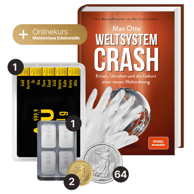 Zusätzlich zu den Edelmetallen erhalten Sie bei der Bestellung des Krisen-Kompass S exklusive Gratiszugaben. Ein Paar Baumwollhandschuhe schützt Ihre wertvollen Anlagen vor Fingerabdrücken und Korrosion, während das Buch "Weltsystem Crash" von Max Otte Ihnen wertvolle Einblicke und Wissen über die wirtschaftlichen Zusammenhänge und die Bedeutung von Edelmetallen in Krisenzeiten vermittelt. Als kostenloses Extra legen wir die "Masterclass Zugangskarte" bei.