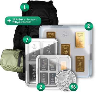 Zusätzlich zu den Edelmetallen enthält dieses Paket einen hochwertigen Notfallrucksack L, der speziell für die Bedürfnisse eines Edelmetall-Investors ausgerüstet ist. Der robuste Rucksack bietet ausreichend Platz und Schutz für Ihre wertvollen Anlagen und ist ideal für den Transport und die sichere Aufbewahrung Ihrer Investitionen.