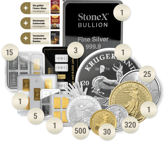 Das Paket besteht aus einer Vielzahl von Edelmetallen in unterschiedlichen Stückelungen und Verpackungen. Diese Diversität gewährleistet nicht nur Flexibilität, sondern auch höchste Sicherheit in Krisenzeiten.