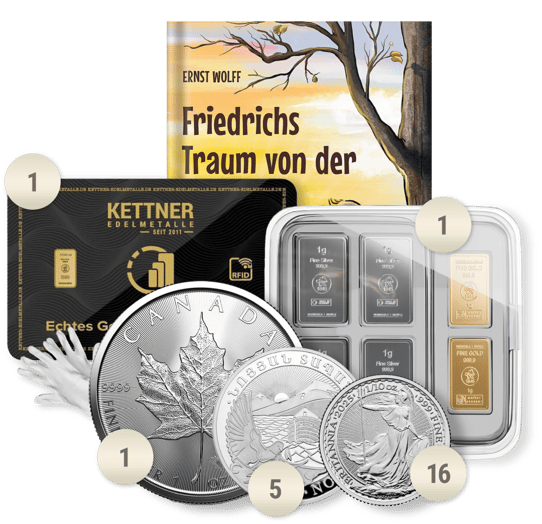 Exklusive Extras: Hochwertige Kettner Krisenschutzbox, professionelle Münzhandschuhe und das aufschlussreiche Buch 'Friedrichs Traum' von Ernst Wolff inklusive