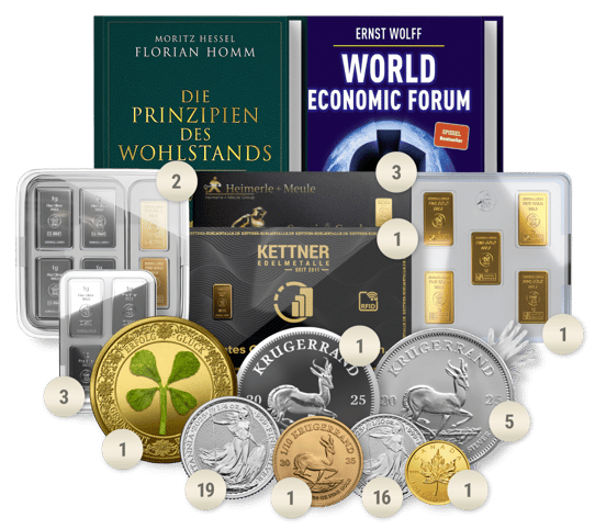 Das Paket setzt sich aus einer Vielzahl von Edelmetallen und Stückelungen zusammen, um Ihnen maximale Flexibilität und Sicherheit und Inflationsschutz zu bieten: