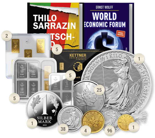 Das Paket setzt sich aus einer Vielzahl von Edelmetallen und Stückelungen zusammen, um Ihnen maximale Flexibilität und Sicherheit und Inflationsschutz zu bieten: