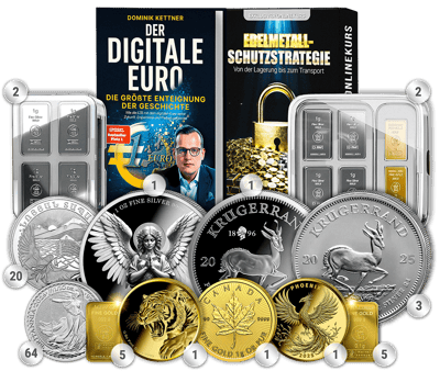 Während Papierwährungen durch Inflation schleichend an Wert verlieren, haben Edelmetalle ihre Kaufkraft über Jahrhunderte bewahrt. Das Selbstverteidigung M Paket bietet Ihnen nicht nur Inflationsschutz, sondern auch die Gewissheit, in jeder Krise handlungsfähig zu bleiben. Mit 733,44 Gramm Feingewicht erhalten Sie eine substantielle Menge an Edelmetallen als umfassende Absicherung gegen: