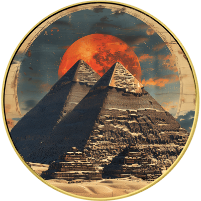 Die Vorderseite präsentiert stolz die ägyptischen Pyramiden, eines der sieben Weltwunder der Antike, in prächtiger Colorierung. Die teilvergoldeten Schriftzüge und die Feinheit heben die Handwerkskunst hervor und verleihen dem Motiv eine erhabene Eleganz. Die Rückseite ist eine Ode an den Obelisken, ein Symbol der Sonnenstrahlen des Gottes Ra, mit dem vergoldeten Nennwert und der Jahreszahl, die den zeitlosen Wert dieser Anlagemünze unterstreichen.