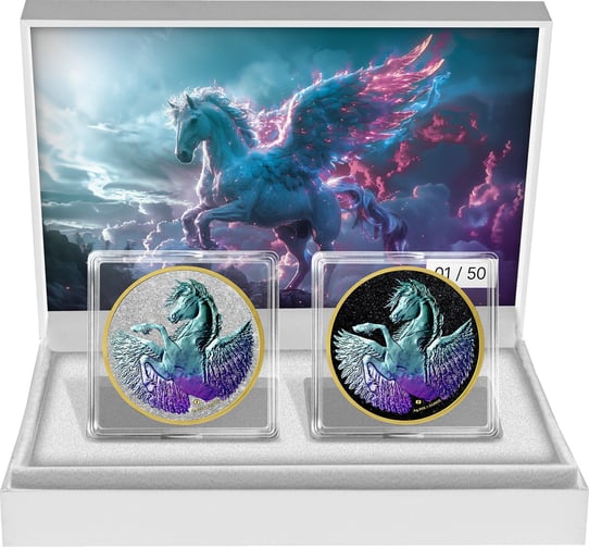 Das "Pegasus Holo Diamond Set" ist eine Hommage an die Schönheit und den Mythos des geflügelten Pferdes Pegasus. Diese streng limitierte Edition, mit einer Auflage von nur 50 Stück, ist ein wahres Meisterwerk der modernen Münzprägung. Jedes Set besteht aus zwei kunstvoll gestalteten Silbermünzen, die nicht nur für Sammler von unschätzbarem Wert sind, sondern auch ein beeindruckendes Zeugnis handwerklicher Präzision darstellen.