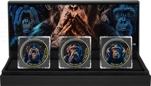 - Motiv: Die ikonischen drei Affen, eingefangen in einer Münzserie, die Weisheit und Ästhetik vereint.