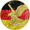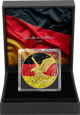 Das klassische Motiv des American Eagles, bestehend aus Liberty und dem stolzen Adler, wird durch eine teilweise Vergoldung noch prachtvoller. Der Hintergrund ziert die deutsche Flagge, ausgestaltet in einem schimmernden Diamond Finish, das die Farben Schwarz-Rot-Gold zum Leuchten bringt. Die Aufschriften sind in einem eleganten Silber gehalten, welches die Ästhetik der Münze abrundet und ihre Exklusivität betont.