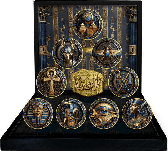 Das Set besteht aus neun Münzen und einem Reliktbarren, die die reiche Kultur und die mystischen Symbole des alten Ägyptens ehren: