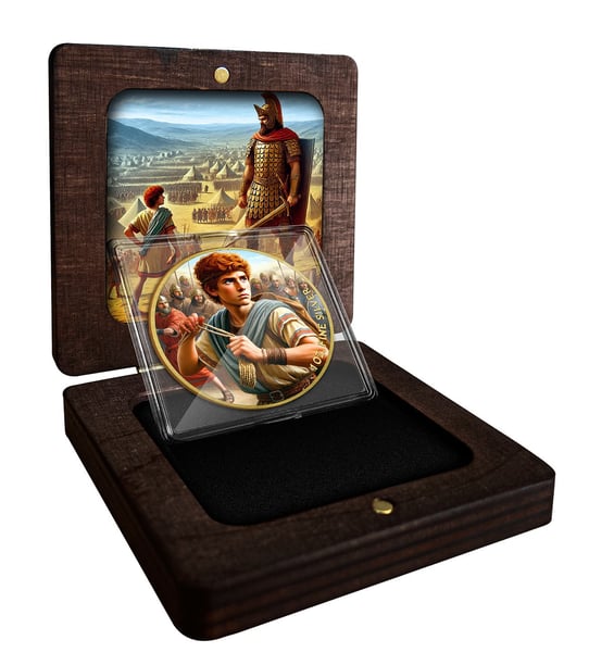 Das Motiv dieser Münze erzählt die epische Geschichte des jungen David, der den riesigen Goliath besiegt. Auf der Vorderseite der Münze ist David dargestellt, wie er sich mutig auf den Kampf vorbereitet, während im Hintergrund Krieger zu sehen sind. Die Rückseite zeigt den imposanten Goliath, der ebenfalls vor Kriegern steht. Der Münzrand und die Schriftzüge sind vergoldet, was dem Design eine besondere Eleganz verleiht.
