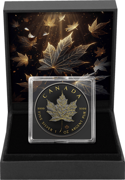 Diese Münze besticht durch ihre außergewöhnliche Kombination aus edlen Materialien und kunstvoller Gestaltung. Die Grundlage bildet eine 1 Unze Silber Maple Leaf mit einem Feingewicht von 31,10 g und einem Durchmesser von 38,00 mm. Mit einer Feinheit von 999,9/1.000 ist diese Münze von höchster Qualität. Der Hintergrund der Münze wurde schwarz coloriert, was den glänzenden, vergoldeten Schriftzügen und Blattadern einen besonders edlen Kontrast verleiht. Die Motive wurden zusätzlich mit Ruthenium veredelt, was der Münze einen unvergleichlichen Glanz und eine besondere Tiefe verleiht.