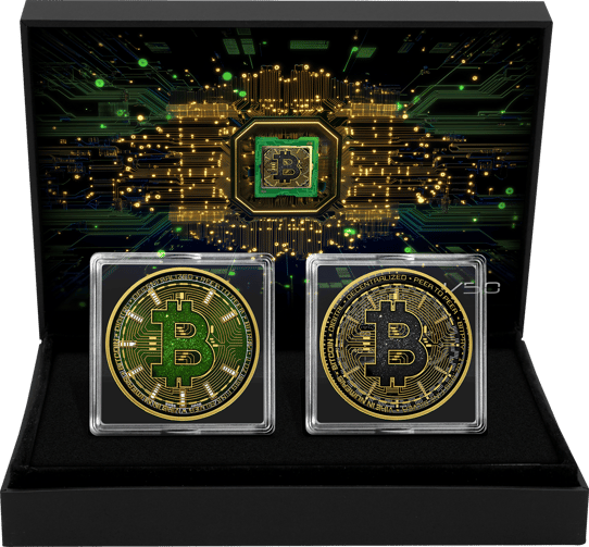 - Motiv: Einzigartige Bitcoin-Symbolik mit faszinierender Kolorierung und Teilvergoldung