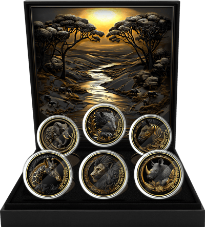 Das Set besteht aus sechs atemberaubenden Silbermünzen, die jeweils ein ikonisches afrikanisches Tier in einer detailreichen und kunstvollen Darstellung zeigen:
