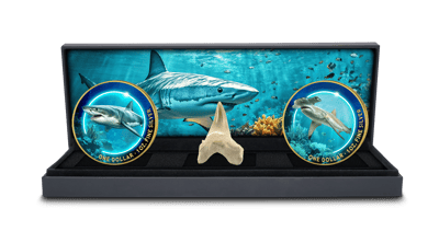 Streng limitierte Rarität: Exklusiv bei Kettner Edelmetalle erhältliches Sammlerset mit nur 50 Exemplaren weltweit und einem echten Haizahn als besonderes Highlight