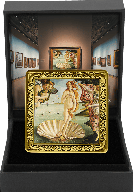 Mit dieser Sammlermünze präsentieren wir Ihnen einen besonderen Schatz der Kunstgeschichte in Form eines Silberbarrens. Die exklusive Prägung zeigt Botticellis weltberühmtes Meisterwerk "Die Geburt der Venus" in einem kunstvoll gestalteten, vergoldeten Bilderrahmen.