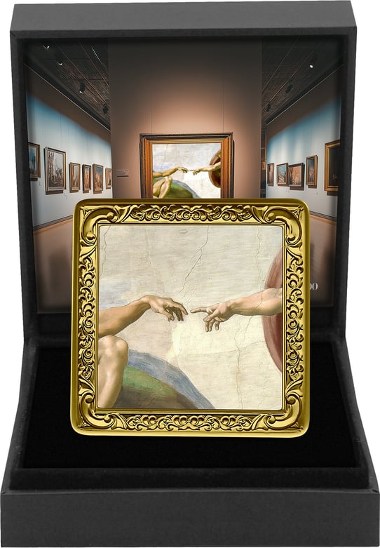 Diese seltene Sammlermünze präsentiert eines der berühmtesten Kunstwerke der Menschheit in einem innovativen Format. Der quadratische Silberbarren zeigt Michelangelos "Die Erschaffung Adams" in einem kunstvoll gestalteten, vergoldeten Bilderrahmen.