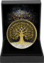 Diese Sammlermünze ist eine wahre Augenweide für anspruchsvolle Sammler. Die exklusive Veredelung vereint gleich mehrere hochwertige Techniken: Die Vorderseite zeigt einen majestätischen Lebensbaum in strahlender Goldfarbe, dessen feine Verästelungen sich vor einem mit schwarzem und weißem Diamantpulver veredelten Hintergrund abheben. Die Rückseite präsentiert eine kunstvolle Mondszene mit goldenen Sternen.