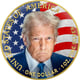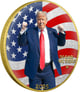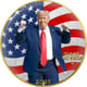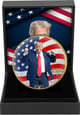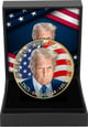 Das Münzdesign zeigt ein eindrucksvolles Porträt von Donald Trump vor dem Hintergrund der amerikanischen Flagge. Die Vorderseite präsentiert eine dynamische Pose des ehemaligen Präsidenten, während die Rückseite ein würdevolles Porträt mit der Umschrift "UNITED STATES OF AMERICA" zeigt. Die hochwertige Veredelung betont dabei besonders die patriotischen Details.