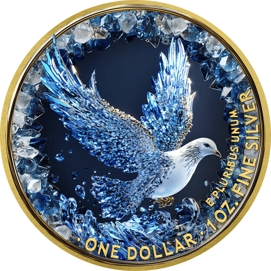 Diese exklusive 1 Unze Silbermünzen der US Mint präsentiert sich in einem atemberaubenden kristallinen Design. Die hochwertig veredelte Münze zeigt auf ihrer Vorderseite eine majestätische Friedenstaube, deren Flügel in verschiedenen Blautönen schimmern. Die kunstvolle Gestaltung wird durch die teilvergoldete Umrandung perfekt abgerundet.
