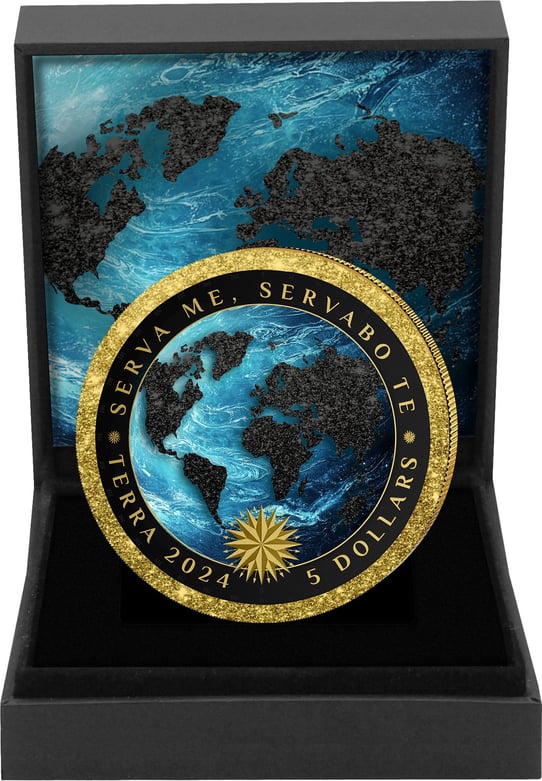 Die Sammlermünze "Black Terra Iced Out 2024" ist eine seltene Sammlermünze, die durch ihr außergewöhnliches Design besticht. Die Silbermünzen zeigt unseren Planeten in einer einzigartigen Perspektive - die Kontinente sind in tiefem Schwarz gehalten, während die Ozeane in leuchtendem Türkisblau erstrahlen.