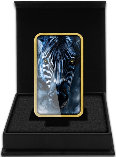 Teilvergoldeter Silberbarren mit kunstvollem Zebra-Motiv in beeindruckender Farbgebung