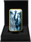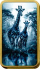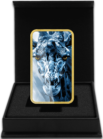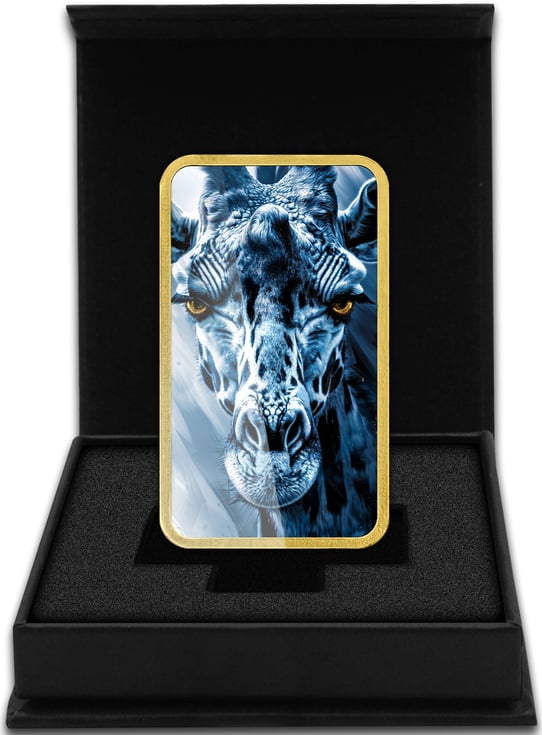 Das Motiv zeigt eine beeindruckende Giraffenfamilie in einer mystisch anmutenden Savannenszenerie. Die kunstvolle Kolorierung in verschiedenen Blautönen verleiht dem Motiv eine geheimnisvolle Tiefe, während die teilvergoldete Umrandung einen edlen Rahmen schafft. Mit einer streng limitierten Auflage von nur 50 Stück weltweit ist dieser Barren eine absolute Rarität.