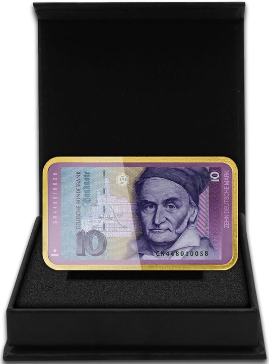 Historisches Motiv: Die detailgetreue Reproduktion des legendären 10 DM Scheins mit Carl Friedrich Gauß wurde in höchster Präzision und edler Teilvergoldung umgesetzt