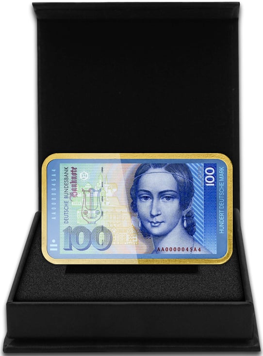 Limitierte Rarität: Ein absolutes Sammlerhighlight mit nur 100 Exemplaren weltweit - die detailgetreue Nachbildung des historischen 100 DM Scheins als teilvergoldeter Silberbarren