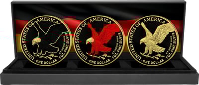 - Motiv: Einzigartiges Set mit drei American Eagles in Schwarz, Rot und Gold