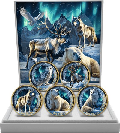 • checkmark greenFünf teilvergoldete Silbermünzen mit faszinierenden nordischen Wildtieren vor dem Polarlicht
