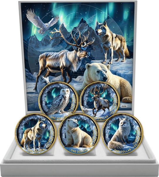 Kunstvolle Veredelung: Die teilvergoldeten und aufwendig kolorierten Silbermünzen zeigen fünf majestätische nordische Wildtiere vor dem magischen Polarlicht