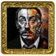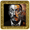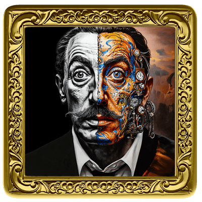 Die Rückseite überrascht mit einem faszinierenden Porträt des Künstlers selbst - kunstvoll gestaltet in einem einzigartigen Two-Face-Design. Die eine Gesichtshälfte zeigt Dali in klassischer Schwarz-Weiß-Darstellung, während die andere Hälfte in surrealistischer Manier mit Uhren und mechanischen Elementen verschmilzt.
