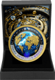 Das Motiv zeigt eine kunstvoll gestaltete Weltkarte mit vergoldeten Kontinenten vor einem tiefblauen Ozean-Hintergrund. Umrahmt wird das Motiv von einem Ring mit den zwölf Tierkreiszeichen und einer mit Diamantstaub veredelten Beschriftung. Die teilvergoldete Münze wird in einem hochwertigen Etui geliefert und ist damit perfekt vor äußeren Einflüssen geschützt.