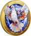 Die Vorderseite zeigt eine majestätische Friedenstaube im faszinierenden Kirchenfenster-Design. Die hochwertige Kolorierung in verschiedenen Blau- und Rottönen verleiht den Flügeln eine beeindruckende Tiefenwirkung. Der teilvergoldete Rand umrahmt das Motiv elegant und unterstreicht die Exklusivität dieser besonderen Ausgabe.