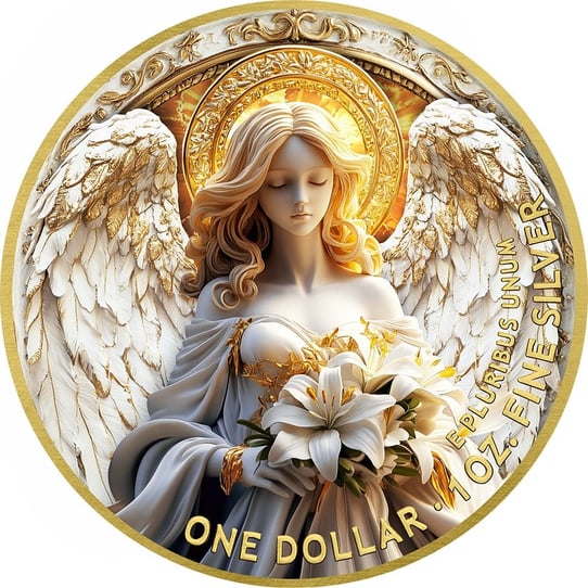 Der Schutzengel wird von einem goldenen Heiligenschein umrahmt, seine detailreich gestalteten Flügel strahlen Kraft und Anmut aus. In seinen Händen hält er makellose weiße Lilien - ein traditionelles Symbol für Reinheit und göttlichen Schutz. Die Rückseite präsentiert eine einzelne prachtvolle Lilie vor einem dramatischen Himmelshintergrund, kunstvoll teilvergoldet und mit der Inschrift "IN GOD WE TRUST".