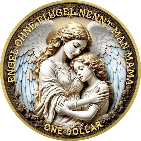 Die Vorderseite zeigt einen anmutigen Schutzengel in einer innigen Umarmung, während die Rückseite von einem kunstvoll gestalteten Herz mit der Aufschrift "Danke Mama" dominiert wird. Die hochwertige Kombination aus blauer Kolorierung und Teilvergoldung verleiht der Münze eine besondere Strahlkraft.