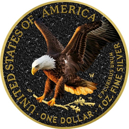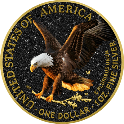 Einzigartiges Design: Die hochwertige Veredelung mit schwarzem Diamantstaub und goldenen Akzenten macht diese American Eagle Münze zu einem beeindruckenden Kunstwerk