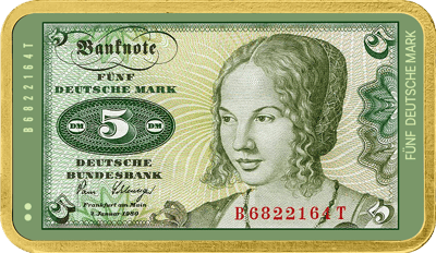 - Motiv: Nostalgische Darstellung des historischen 5-DM-Geldscheins als kunstvolles Sammlerobjekt