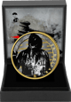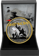 Die vollflächig vergoldete und anschließend colorierte Silbermünze zeigt auf ihrer Vorderseite eines der kraftvollsten Banksy-Motive: Ein vermummter Demonstrant schwingt einen Hammer, während er in der anderen Hand ein aufgeschlagenes Buch hält. Vor ihm kniet eine weitere Gestalt – ein Sinnbild für Widerstand und Wandel. Der charakteristische Schwarz-Weiß-Stil, für den Banksy weltberühmt ist, wurde hier meisterhaft auf 999,9er Feinsilber übertragen. Golden schimmert der Schriftzug "BANKSY" über dem Motiv und verleiht der Münze ihre unverwechselbare Präsenz.